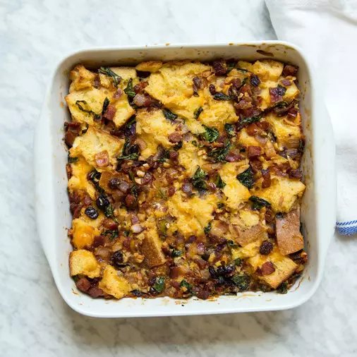 - Add Bread chunks, bacon, ham, cheddar, onion, and scallion to a large bowl; mix until combined; pour into 8×8 Pyrex dish; arrange so even and corners are filled