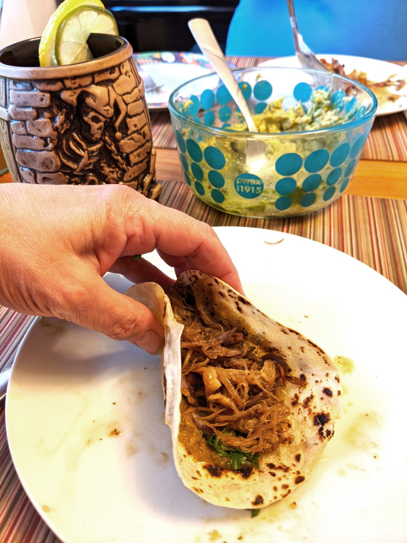 Now it’s ready to serve. We usually do homemade flour tortillas with homemade salsa verde (yes the recipe is coming) plus sliced avocado and pickled red onion with cilantro.