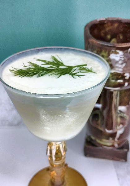 He emerged from his laboratory with a chilled V-martini glass – an antique by the look of it – containing a frothy and creamy ivory liquid garnished with a simple sprig of dill. Yes, dill.