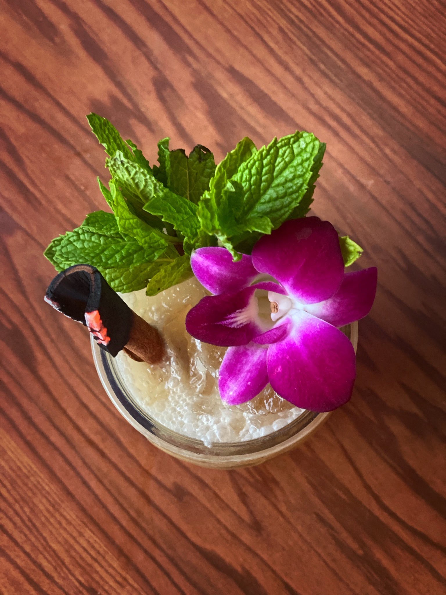 The drink that made my taste buds stand up was one of Gee’s 2023 experiments. Since I’m considered an adult beverage guinea pig among our bar pals, Gee took the opportunity one quiet evening to slide me a fishbowl-style glass with a rich, cocoa-colored liquid.