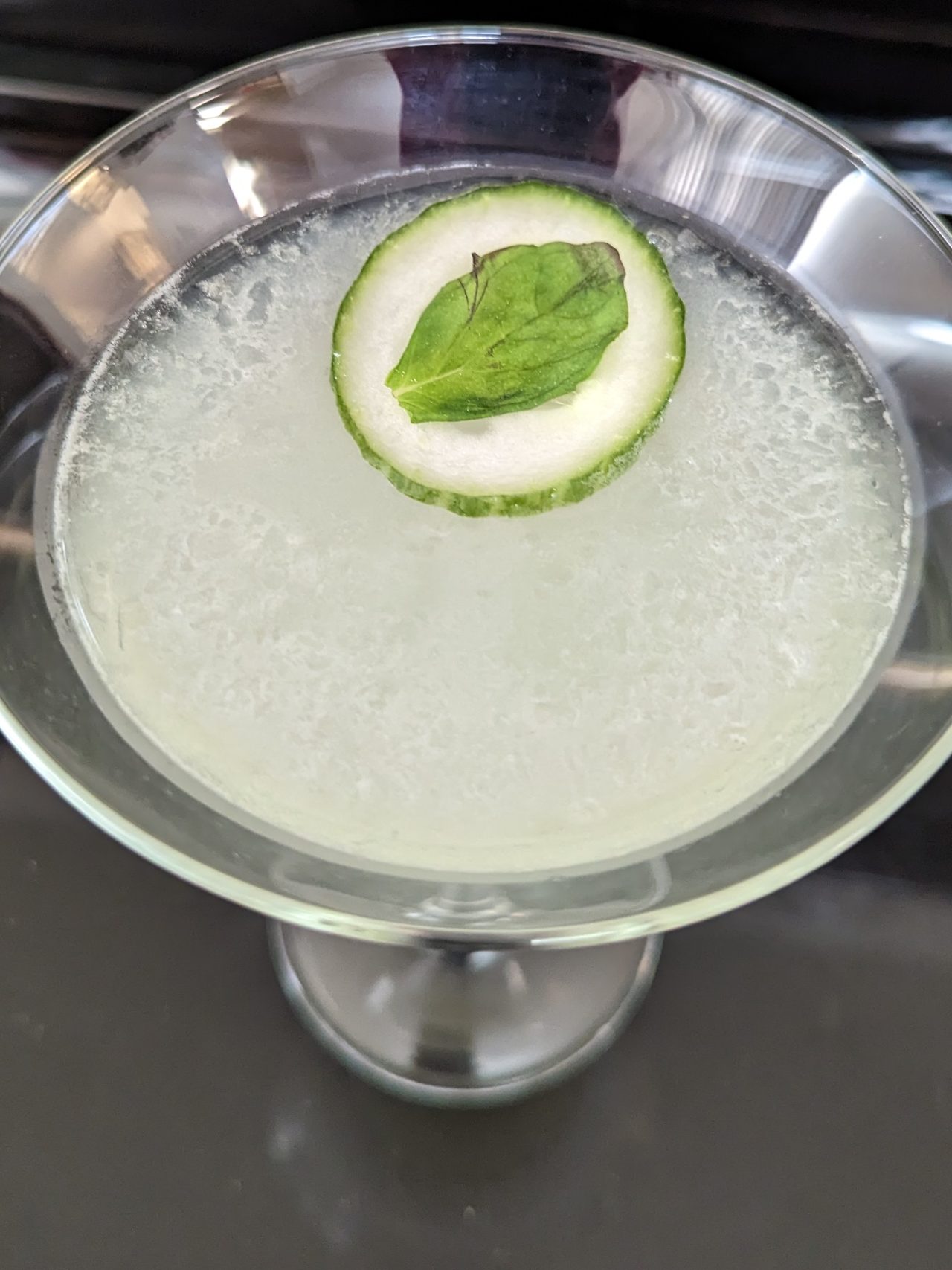 I garnish by floating a thin slice of a cucumber and adding a lightly-bruised fresh mint leaf. I personally do not double-strain – the tiny ice chips add a nice texture and refreshment to this summer classic.